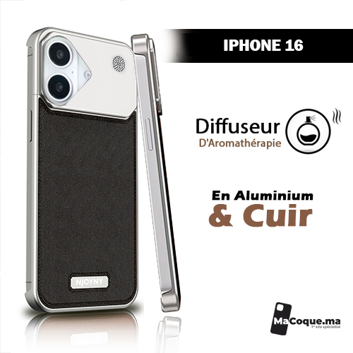 #Noir# Coque iPhone 16 normal en aluminium, Cuir & diffuseur de Parfum .