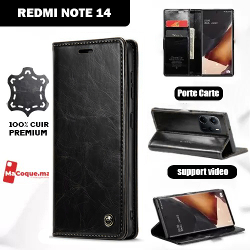 #Noir# 100% CUIR PREMUIM Etui Redmi Note 14 Portefeuille/Porte Carte / Support Video/PROTECTION 360°.