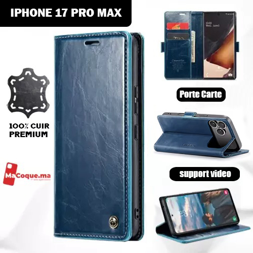 #Bleu# 100% CUIR PREMUIM Coque iPhone 17 PRO MAX Portefeuille/Porte Carte / Support Video/PROTECTION 360°.