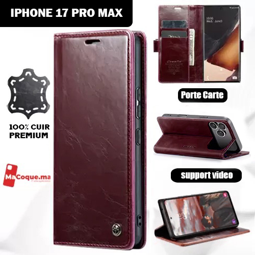 #Bordeau# 100% CUIR PREMUIM Coque iPhone 17 PRO MAX Portefeuille/Porte Carte / Support Video/PROTECTION 360°.